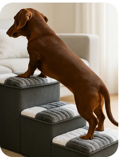 Miękkie, szerokie stopnie (wys. 13 cm) – idealne dla psów do 20 kg oraz starszych pupili z wrażliwymi stawami.